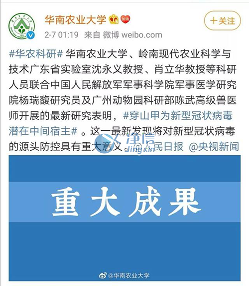 華南農業大學的沈永義和肖立華對比了穿山甲和新型冠狀病毒感染者體內的基因樣本,并結合其他研究結果,發現穿山甲可能是新型冠狀病毒的潛在來源。兩位研究人員在2月7日舉行的新聞發布會上表示,二者序列之間的相似度高達99%。